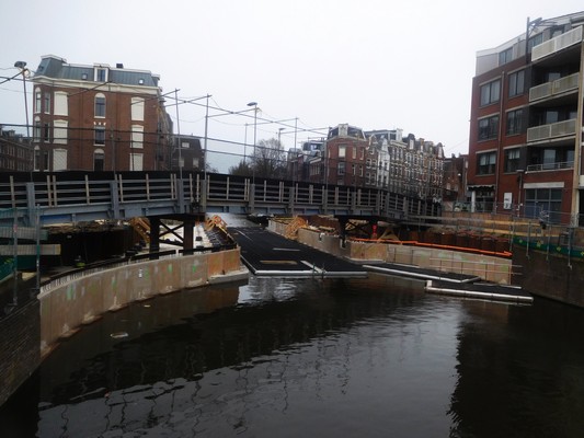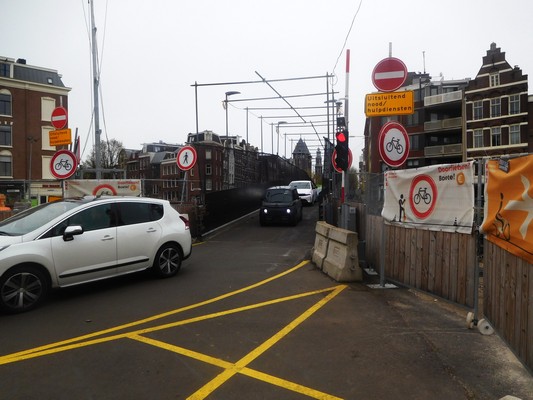 Hulpbrug voor autoverkeer tijdens de renovatie van brug 117 in de Rozengracht over de Lijnbaansgracht.